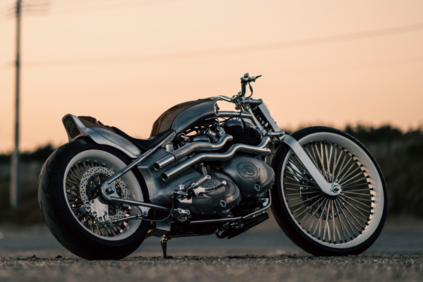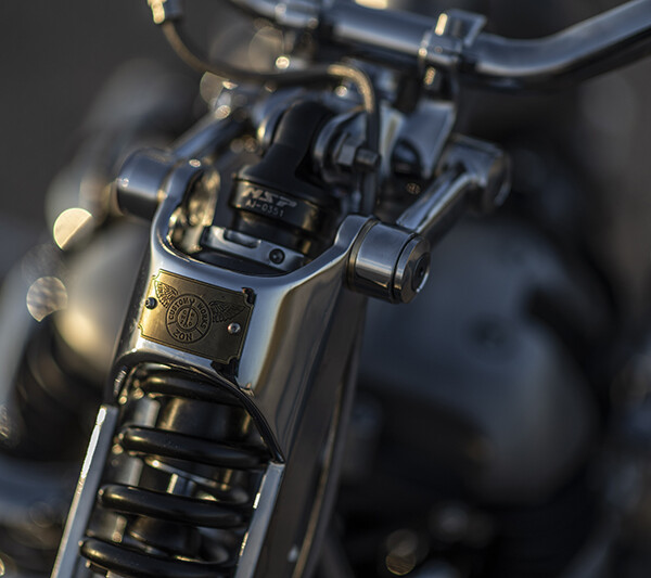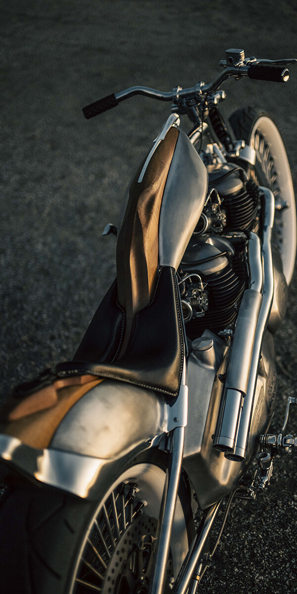 The steel rigid frame and girder fork were originally designed and fabricated in-house. The girder arms were formed using 12 mm steel plates bent, and create a naturally flowing curved surface by hand graving. The top frame tube extending from the steering head is shaped to have both the strength needed to support two engines and the elegance that defines the overall silhouette. To allow engine installation and removal, the lower frame rails are detachable and bolted in place.