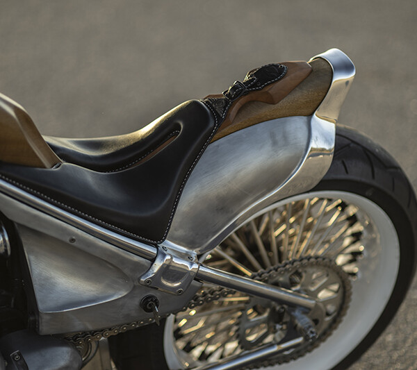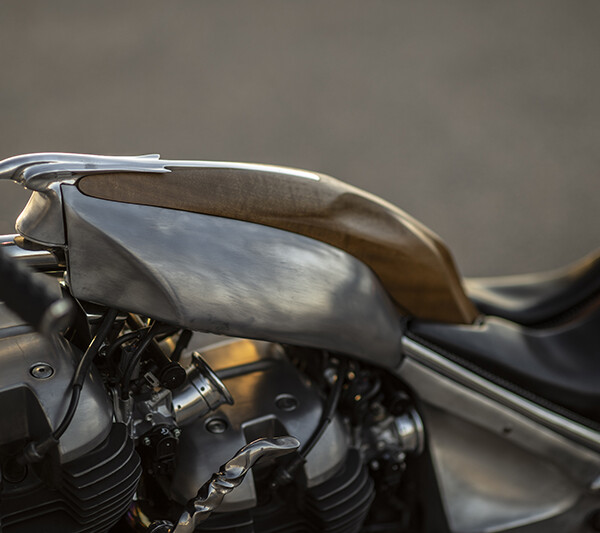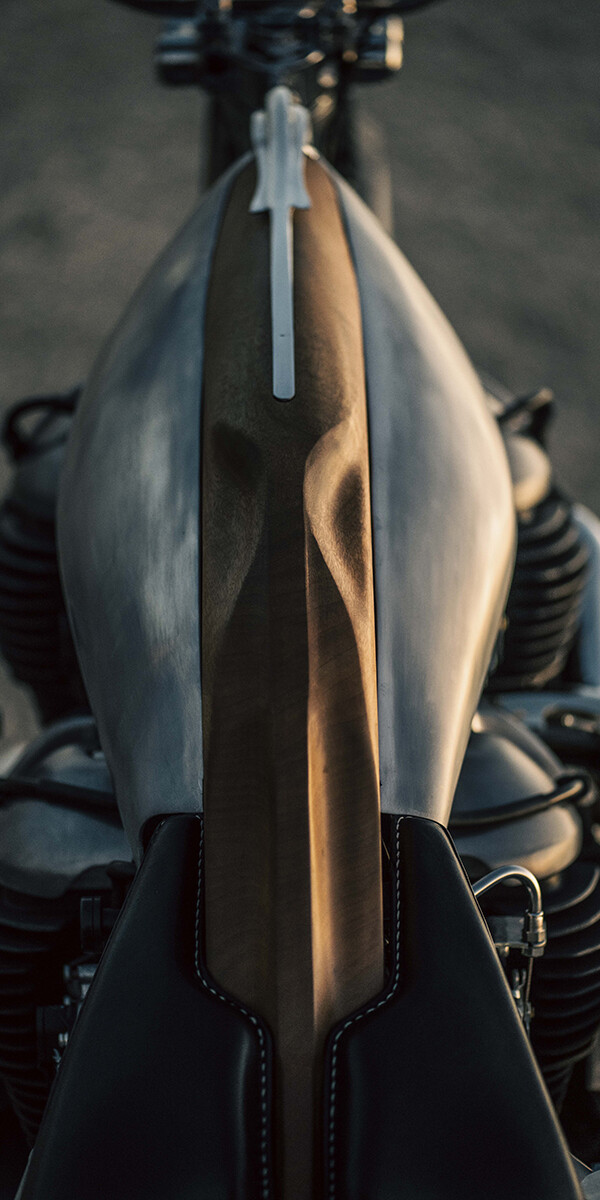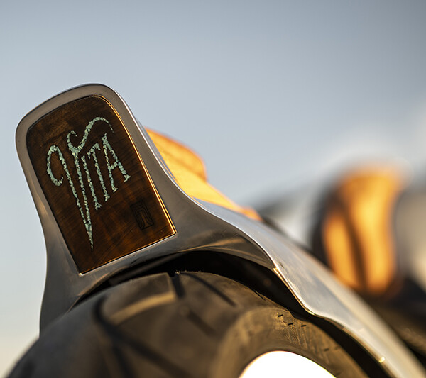 The fuel tank was relocated under the seat on the right side of the bike, handmade by shaping aluminum sheet. The space where the fuel tank would normally be now houses the ECU and electrical components. On the front portion of that fuel tank cover, I placed a bird sculpture carved from a solid block of aluminum. The name “VITA” comes from the Latin word for “life.” Through the bird sculpture, and through the expressive qualities of steel, aluminum, and wood, I wanted to convey a sense of vibrant life and raw energy.