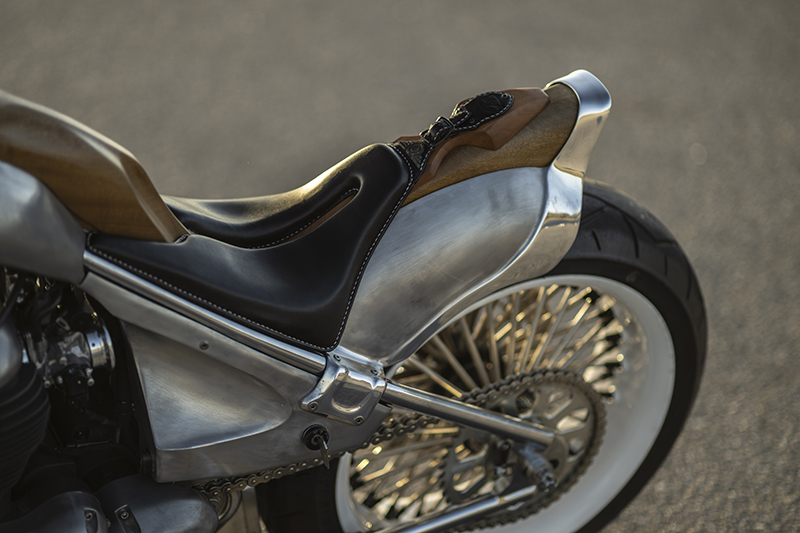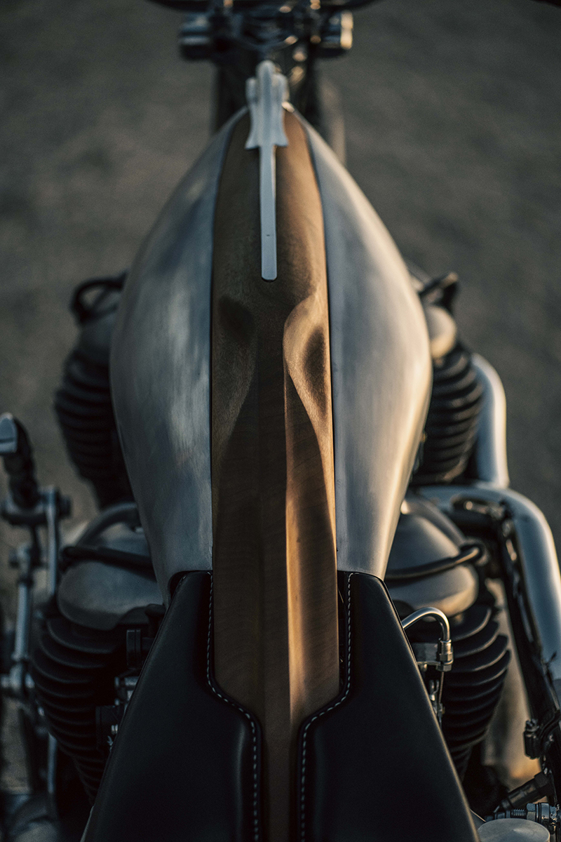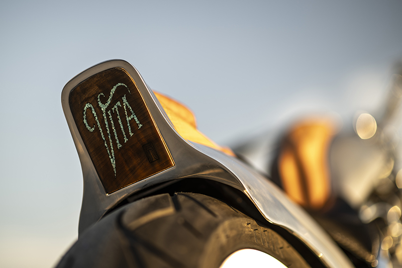The fuel tank was relocated under the seat on the right side of the bike, handmade by shaping aluminum sheet. The space where the fuel tank would normally be now houses the ECU and electrical components. On the front portion of that fuel tank cover, I placed a bird sculpture carved from a solid block of aluminum. The name “VITA” comes from the Latin word for “life.” Through the bird sculpture, and through the expressive qualities of steel, aluminum, and wood, I wanted to convey a sense of vibrant life and raw energy.