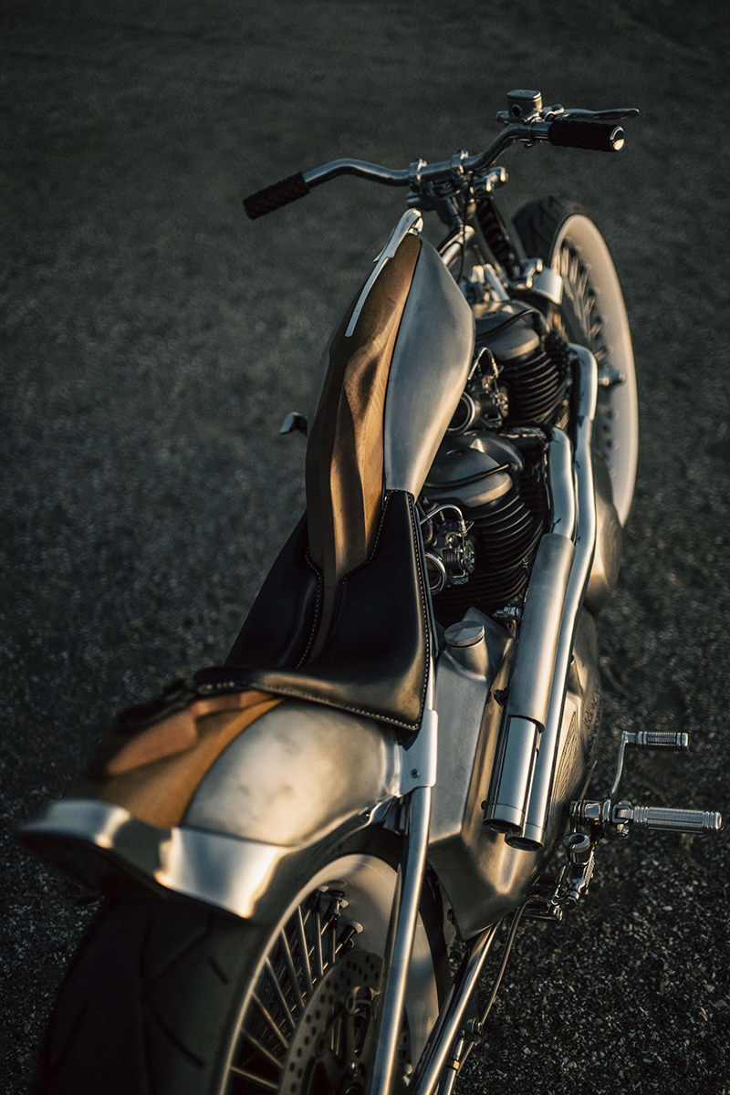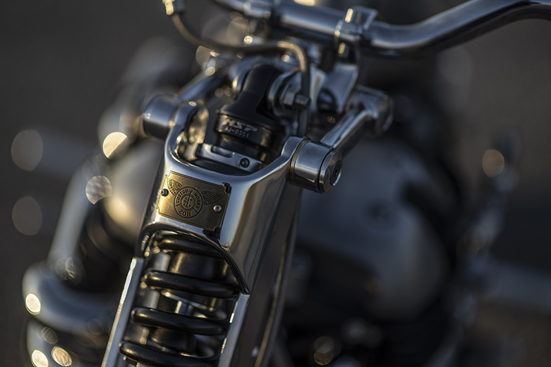The steel rigid frame and girder fork were originally designed and fabricated in-house. The girder arms were formed using 12 mm steel plates bent, and create a naturally flowing curved surface by hand graving. The top frame tube extending from the steering head is shaped to have both the strength needed to support two engines and the elegance that defines the overall silhouette. To allow engine installation and removal, the lower frame rails are detachable and bolted in place.