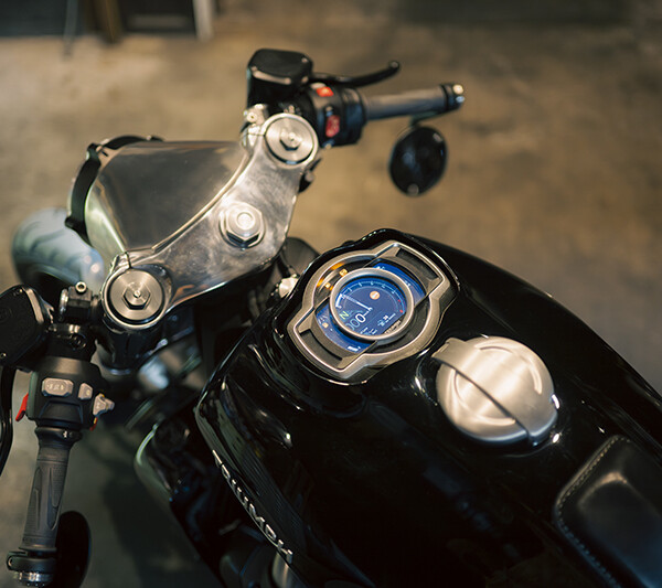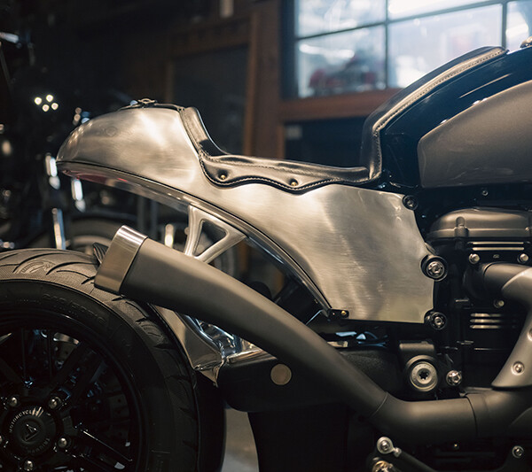 メーターはタンクに埋め込み、突起物を排除。タンク自体も通常より細く仕立て、プレスラインを際立たせた。リア周りはアルミで新造し、前後からの印象が劇的に変わるデザインを実現。リアフェンダーはカーボンとアルミを組み合わせ、大人の渋みを纏わせている。