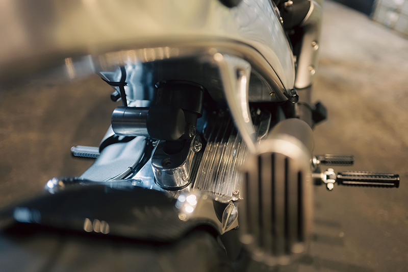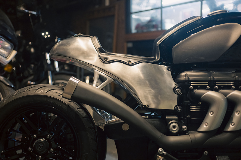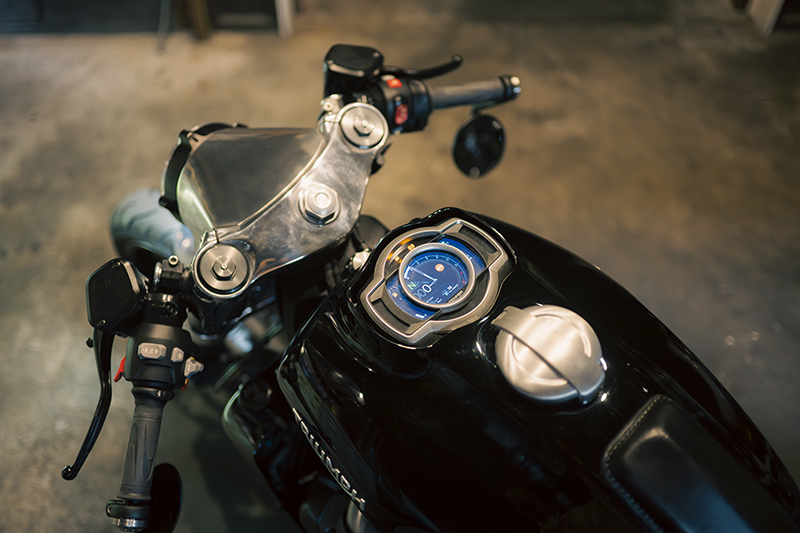 メーターはタンクに埋め込み、突起物を排除。タンク自体も通常より細く仕立て、プレスラインを際立たせた。リア周りはアルミで新造し、前後からの印象が劇的に変わるデザインを実現。リアフェンダーはカーボンとアルミを組み合わせ、大人の渋みを纏わせている。