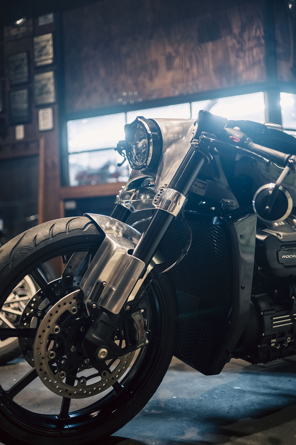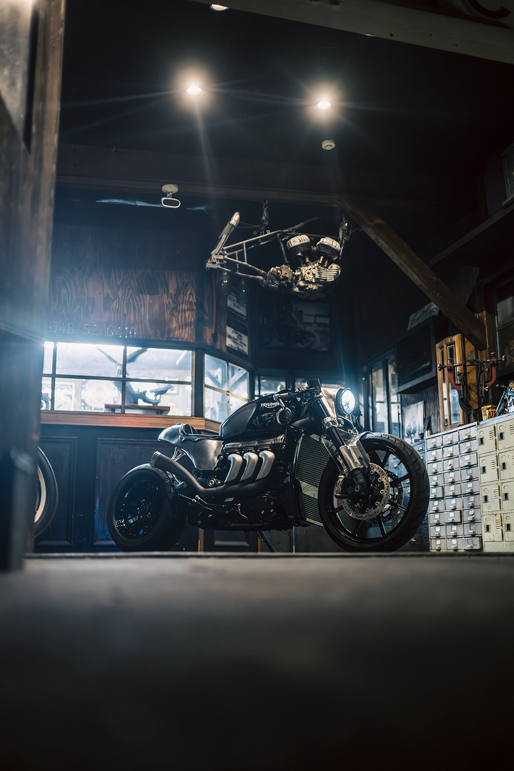 このプロジェクトは、背の高いオーナーにフィットする一台を作る――そんなシンプルな想いからスタートした。ベースに選んだのは圧倒的存在感を放つ TRIUMPH ROCKET 3。もしメーカー純正でこんな仕様が発売されたら…そんな理想を追い求め、完璧な仕上がりを目指した。
